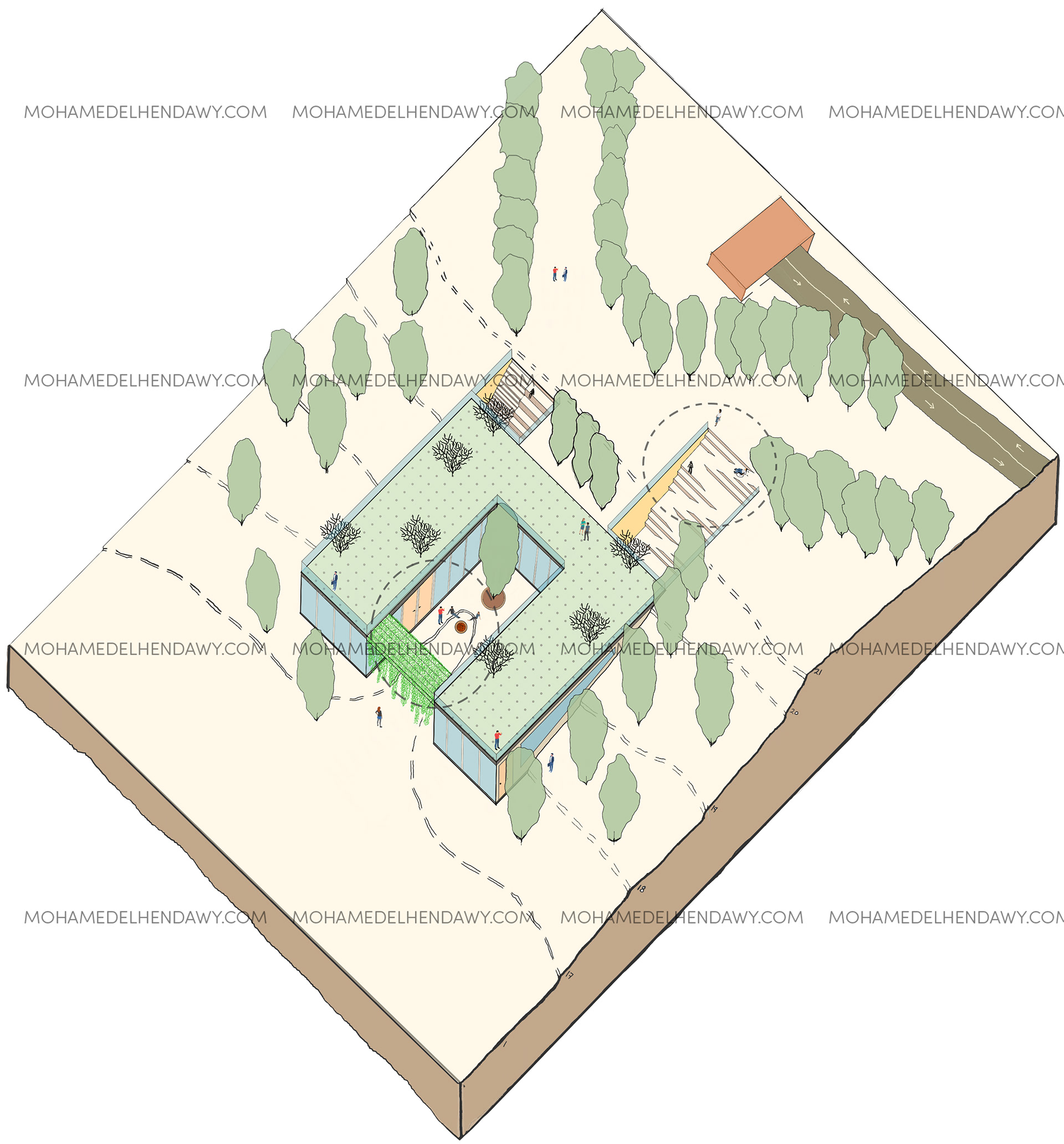 The project involved designing a house for a forester that also serves as a museum and a meeting space. This unique concept integrates the forester's living quarters with areas where visitors can engage with the forester and learn about their work, creating a multifunctional and interactive environment.