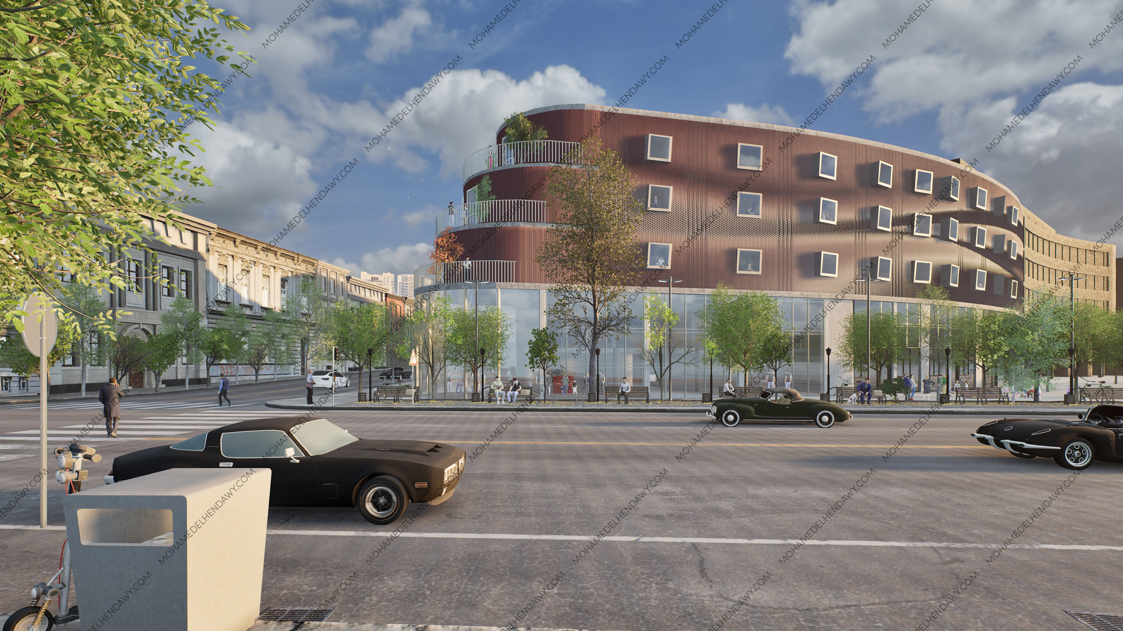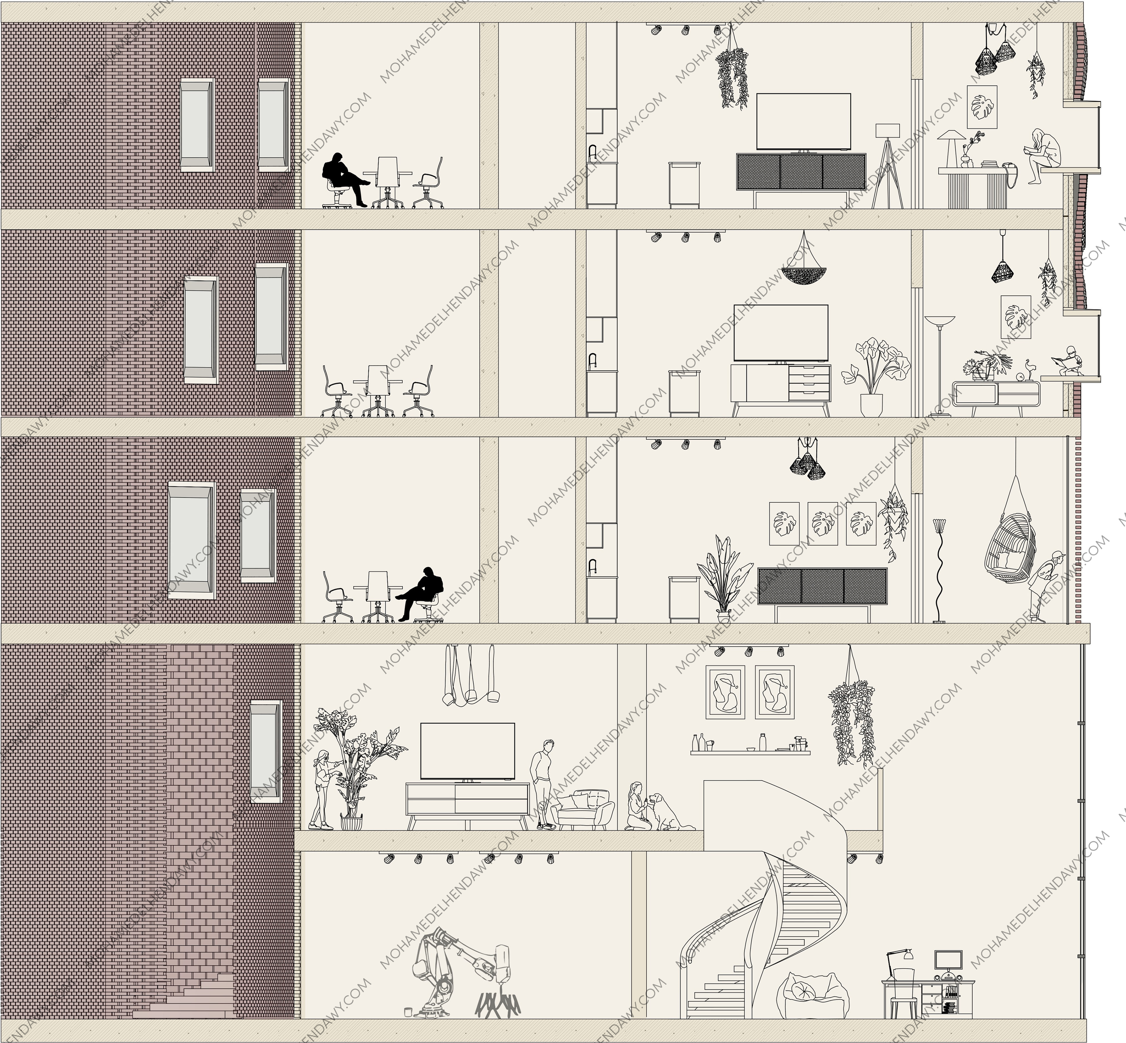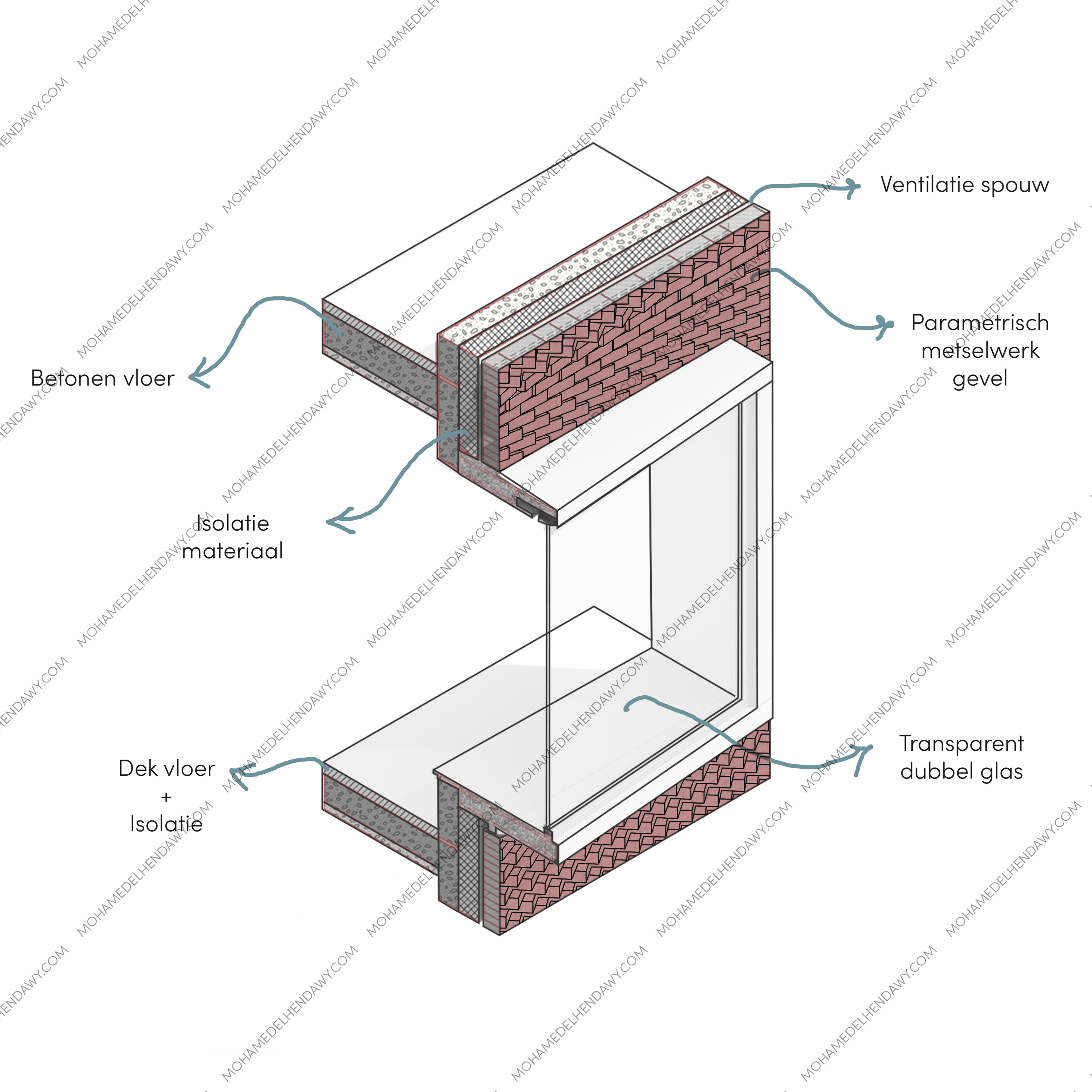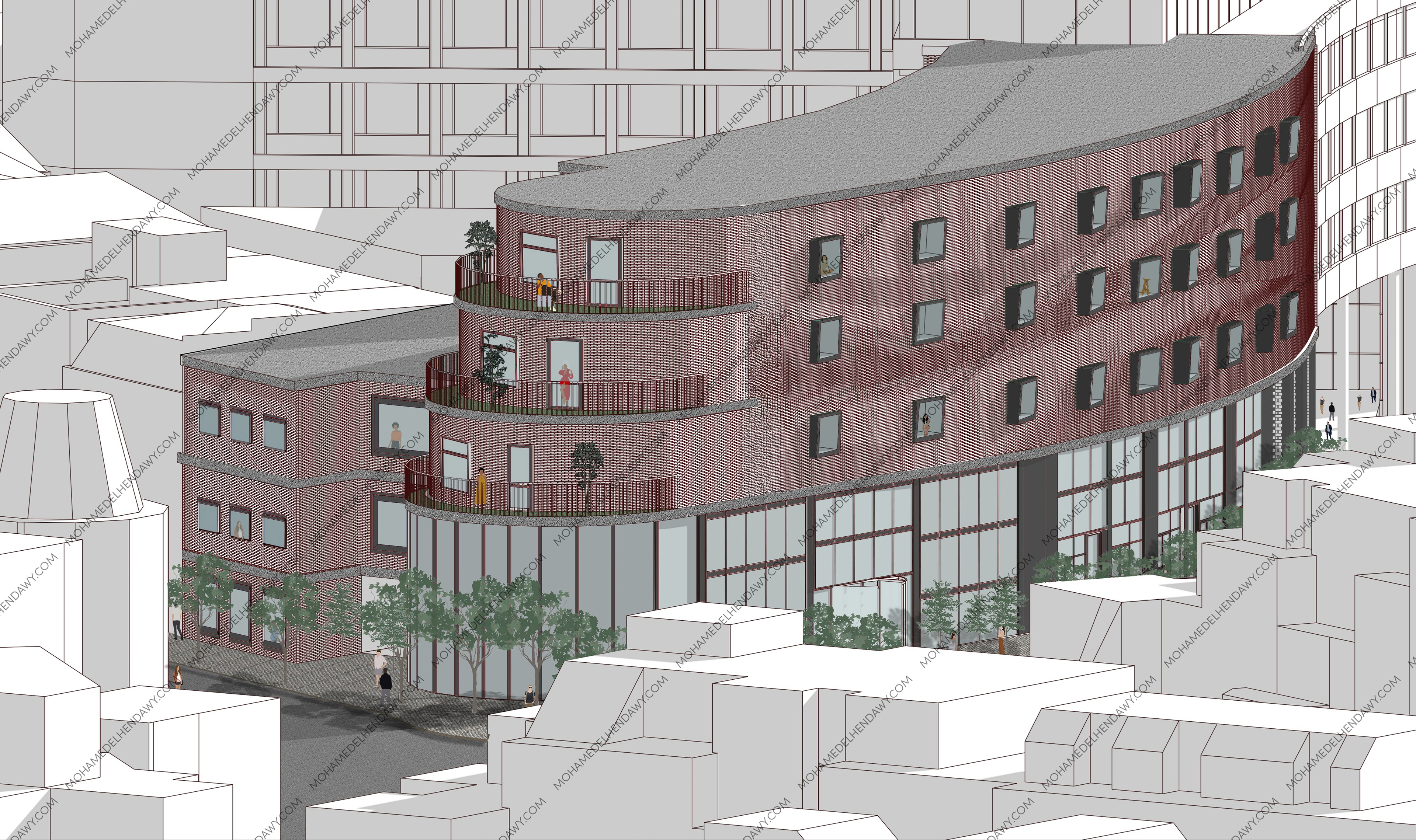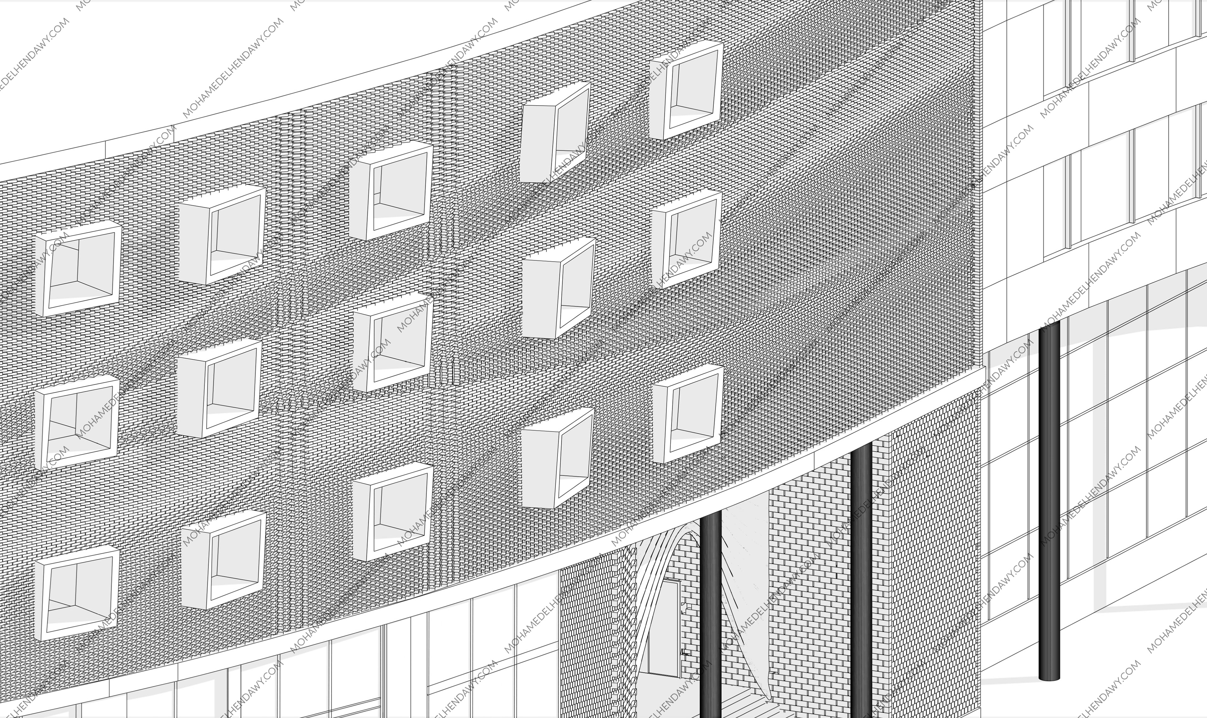 This project transforms the former NIBC Bank building in The Hague into a modern residential complex, blending the existing structure with new housing functions. The concept of affordable luxury drives the design — offering high-quality spaces and materials within a cost-efficient framework. Using Grasshopper with various plugins, a parametric brick facade was created to follow the building’s organic form, optimizing material use while adding a distinct architectural identity. Protruding windows were oriented toward the sun to bring in natural light, improving comfort and reducing energy use. By combining smart design strategies with digital tools, the project shows how affordability and architectural quality can go hand in hand.